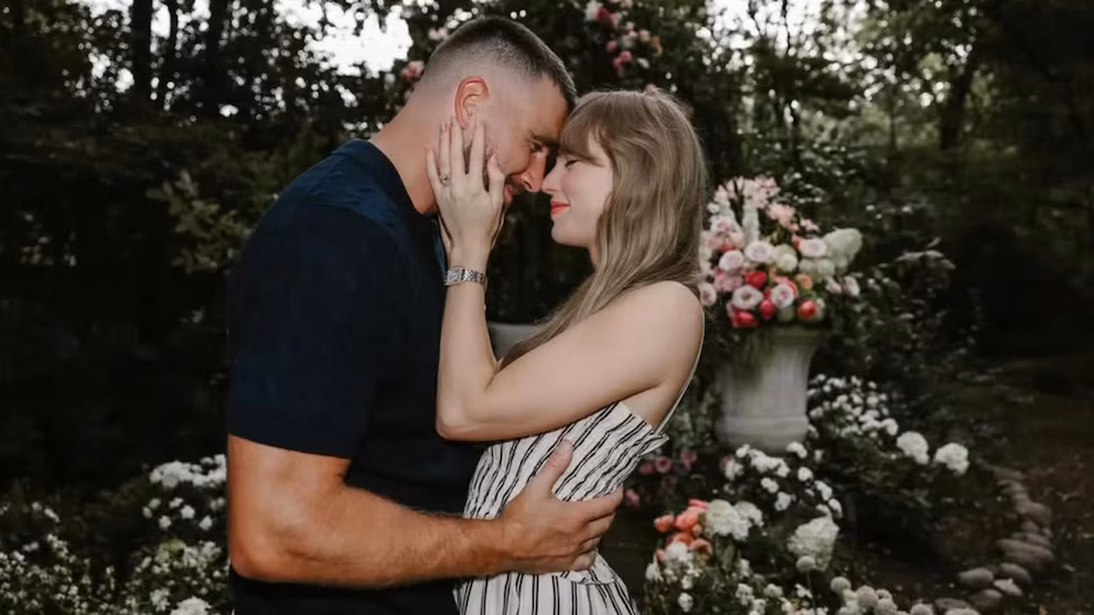 Photos showed the couple in a garden of pink and white flowers. One image showed Kelce on one knee looking up at Swift, and another featured a large ring on Swift’s left hand. A snippet of Swift’s song “So High School” played in the background of the post.