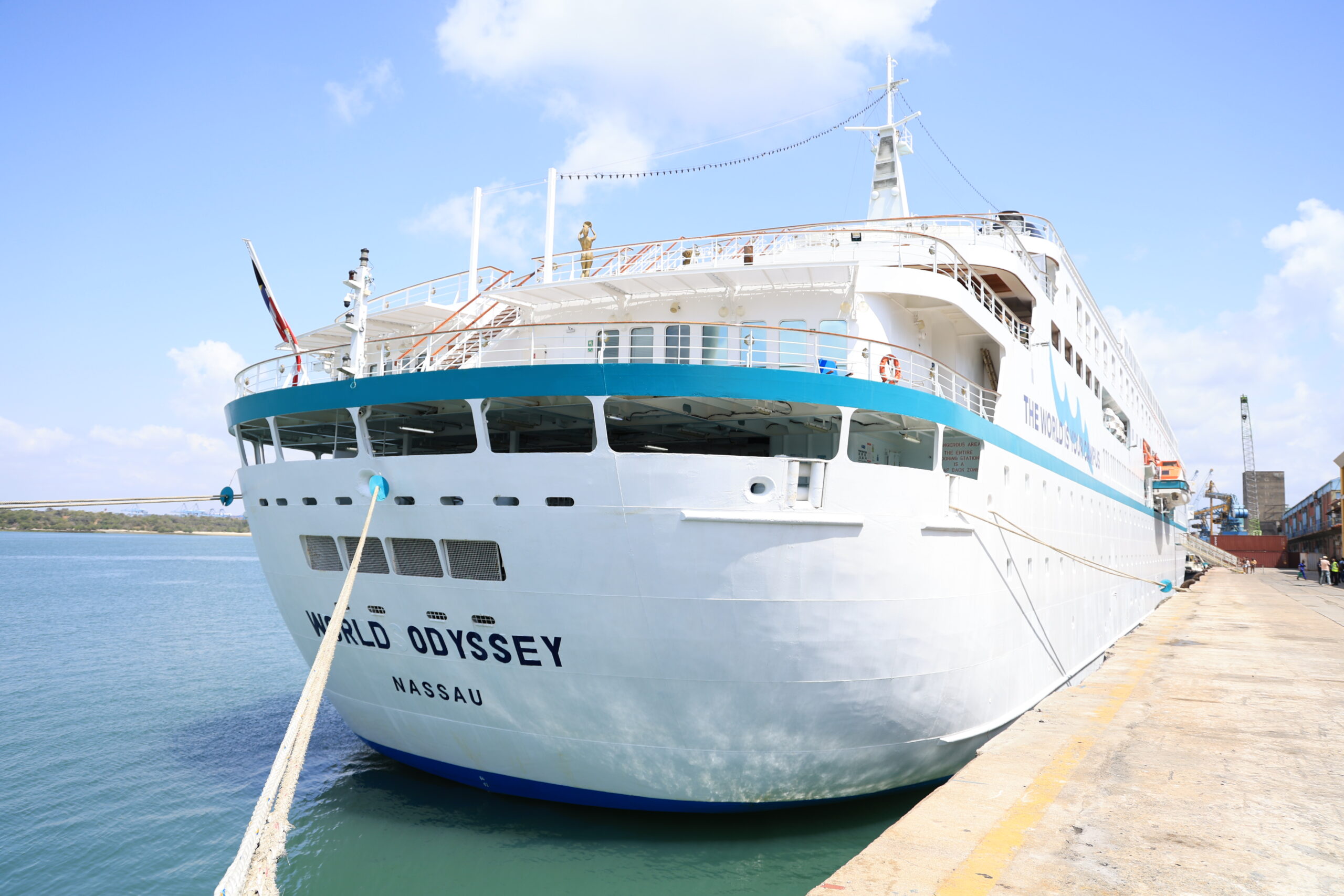 MV Odyssey Cruise ship docked along berth number one at the port of Mombasa with 609 students and 183 crew on board.